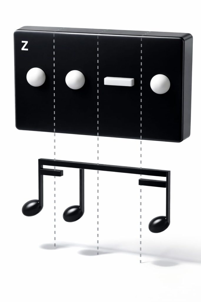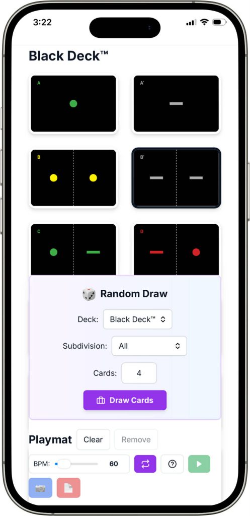 EN : Inspired by Benny Greb & Joe Bergamini‘s famous Rhythmic Alphabet [as well as Phil Perkins‘ Rhythmic Alphabet, Carl Wilhelm Grimm‘s Musical Dominoes, and methods of Jaki Liebezeit (Dashes/Dots system), Gary Chaffee, Mark Guiliana, Udo Dahmen, David Lomazzi, Dante Agostini, George Lawrence Stone, …], Hughes Gallez decided to create his dominoes. (…) Those methods gave Hughes the idea to create a deck of cards incorporating binary and ternary combinations, adding divisions by 1 and by 2. He thus created an alphabet with a letter for each cell, and since the main ones (1, 2, 3, and 4) fall on the letters A, B, E, and L, he decided to call his deck of cards ABEL! It is available in two versions: black cards, which offer a symbolic representation of the divisions, with dots for notes and dashes for rests, and white cards, which display the figures written in traditional rhythmic solfรจge. Of course, you can play with several people, each performing the phrases suggested by the randomly drawn cards (…)